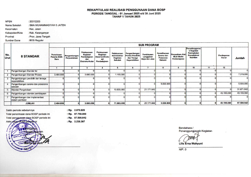 Rekapitulasi realisasi penggunaan dan BOSP tahap 1 tahun 2025